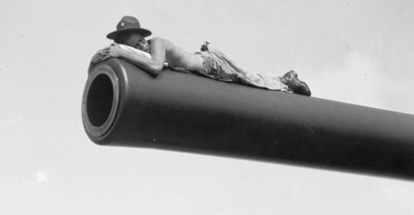 Side - Panama Canal Department. 'On the Alert' Time out for a snooze. Coast artilleryman catching a few short winks on the muzzle of a 14'' railway gun during the joint Army and Navy Maneuvers