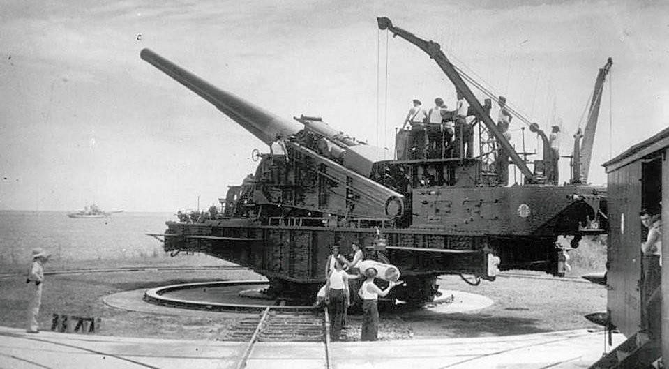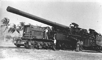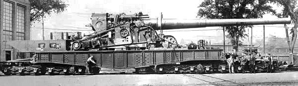 A dismounted and emplaced 14-inch M1920 railroad gun which could move from the Atlantic coast to the Pacific coast by railroad if needed.