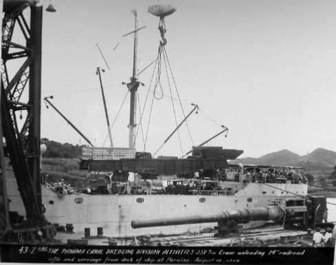 Unloading of 14" Rail Gun assembly at Paraiso in Panama on Aug.18,1928