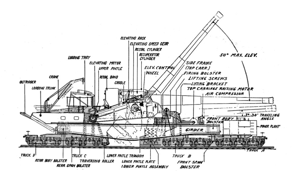 While the entire barrel could be raised to an angle of 50° degrees elevation, it could only be fired from 0° to 19° while on its railroad chassis. This practical limit prevented the recoil from over-stressing the rail supports.