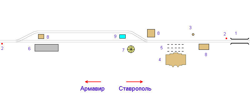 Below is a diagram of the location of objects at the station according to Denis Morozov. There were probably more tracks at the station. Only those that are guaranteed to exist are shown. The scale and proportions in the diagram are not respected.