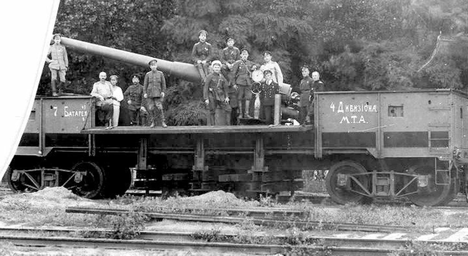 A group of white army officers on the artillery railway platform "7 battery of the 4th division MTA", in 1919